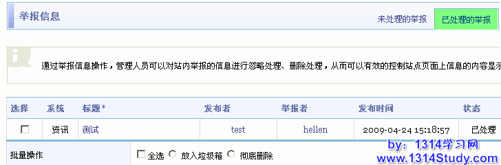 通过 SupeSite 的举报信息管理功能,您可以将会员举报的不良信息进行放入垃圾箱、彻底删除、忽略的操作。
