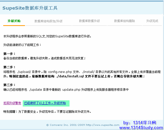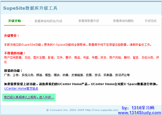 2、由于 SupeSite 7.0 已经不再整合 X-Space 了,所以升级前请确认您已经将 X-Space 数据备份好并且转换到了 UCHome。