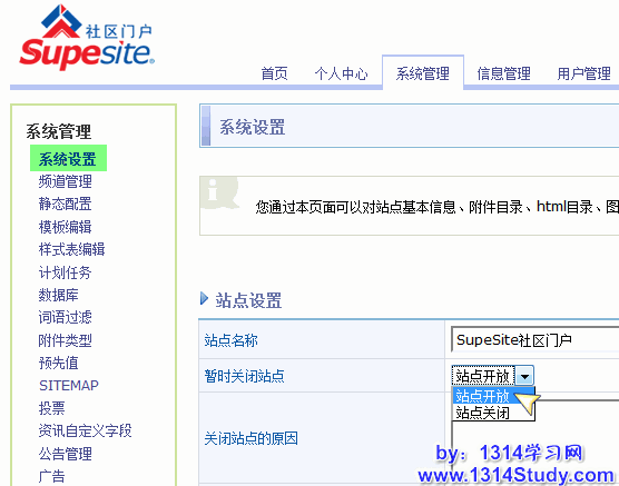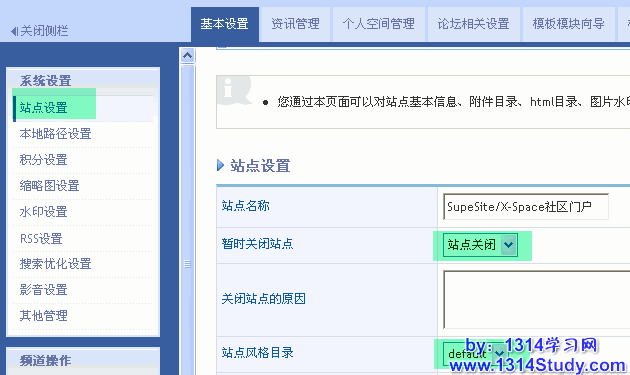 3、关闭 SupeSite/X-Space 并且修改站点风格为默认风格