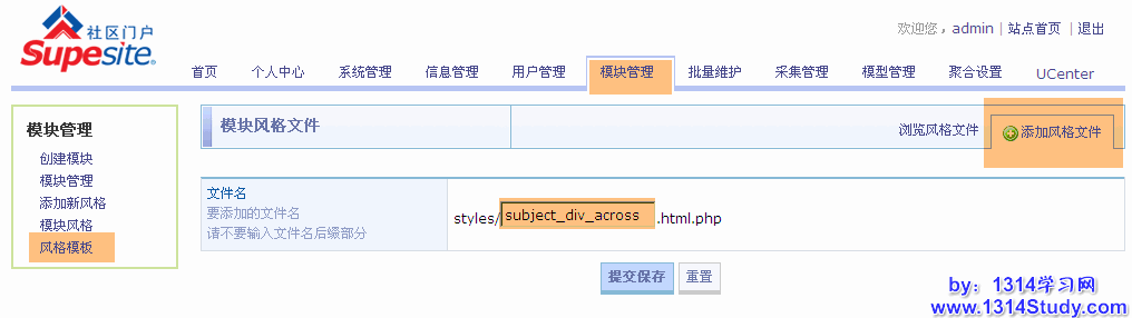 首先进入 后台 => 模块管理 => 风格模板,点击右侧的“添加风格文件”,此处会提示您输入一个文件名,如标题横排风格:我们输入“subject_div_across”。如下图所示:
