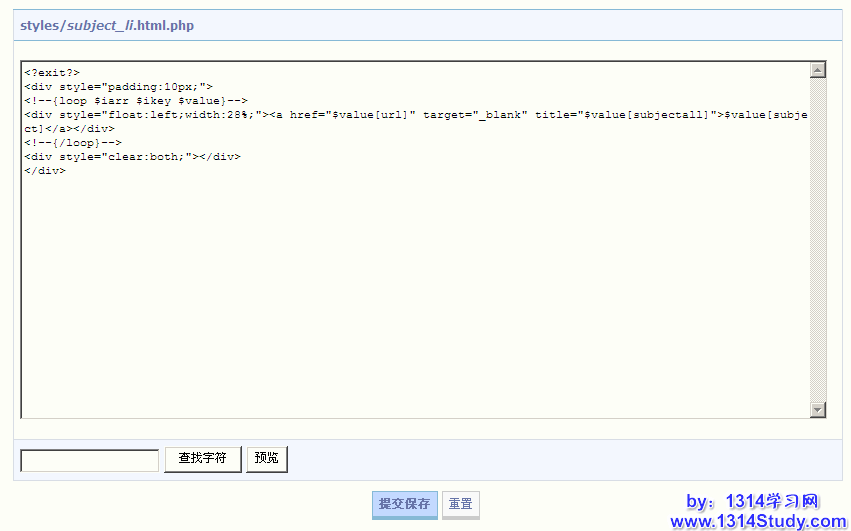 点击“提交保存”以后,系统会自动在Style目录中创建一个名为“subject_div_across.thml.php”文件,并自动进入此文件的编辑模式。