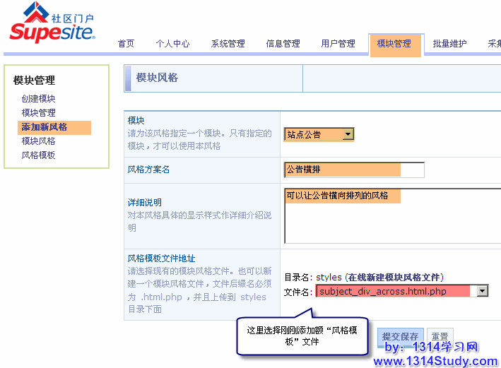 现在要建立一个公告横排的“模块风格”,进入 后台 => 模块管理 => 添加新风格,按照下图所示填写后并提交保存: