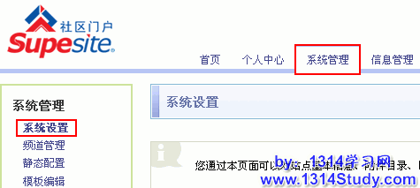 SupeSite 后台首页 => 系统管理 => 系统设置,如下图所示: