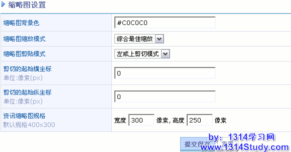 该设置能灵活控制资讯频道缩略图的大小。默认规格为 400x300 ,单位是像素。可以自定义宽度和高度,当设置值小于 20 像素时,程序将自动校正为 100 像素,因此设置的宽度和高度值不要小于 20 像素。