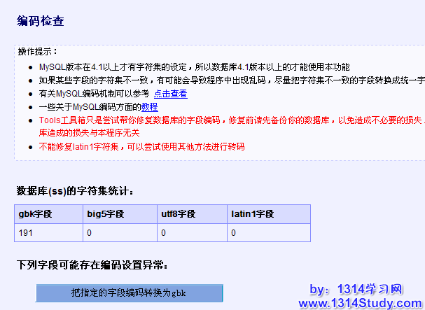 本功能对所有数据表进行编码检查,如果有字段的编码与主要的编码不一致,能够在一定的情况下利用tools修正。