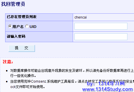 此功能可以帮助站长找回遗忘的管理员,如果应用和 Ucenter 的通信方式是基于 MySQL 进行的,在这个页面就可以完成管理员权限的提升、密码的更改、安全问答的去除等。或者站长可以在此处把用户提升管理员后到 Ucenter 中更改用户的密码信息。