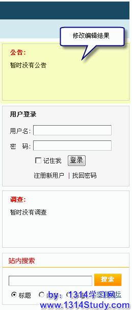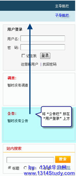 我们的目标:要把首页右侧“公告”放在“用户登录”上方的位置。原首页摆放位置,如下图所示:
