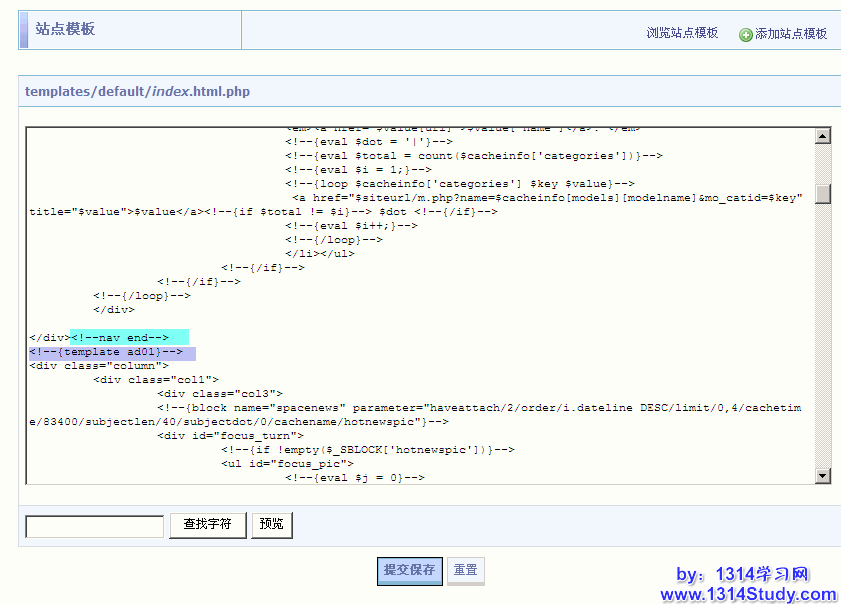 点击要编辑的"index"模板文件后,会出现在线编辑框,如下图所示: