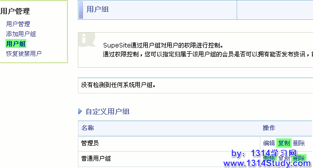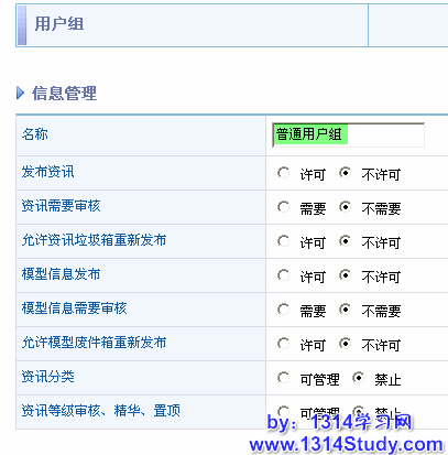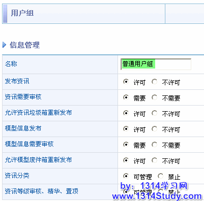 通过权限控制,您可以指定归属于该用户组的会员是否可以拥有能否发布资讯,能否进行信息审核等权限。