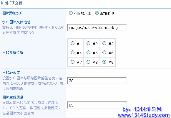 水印设置主要针对上传的图片附件加上个性化图标,作为标志,可以做为防盗链或者宣传工具。