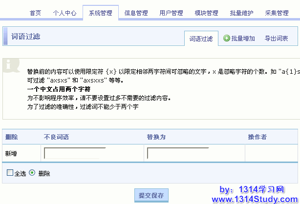 进入 SupeSite 管理后台 => 系统设置 => 词语过滤,可以看到词语过滤的界面,如下图所示: