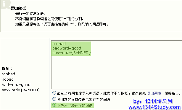2)使用新的设置覆盖已经存在的词语:如果当前批量添加的过滤词语中,包含以前已经存在的,选择此项,则重复的过滤词语将按照当前的设置来替换为相应的内容。