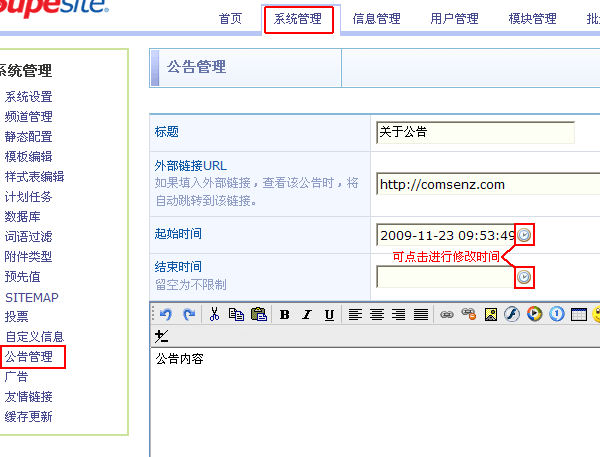 进入 SupeSite 后台 => 系统管理 => 公告管理 => 新增公告