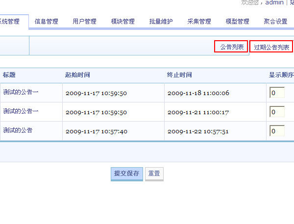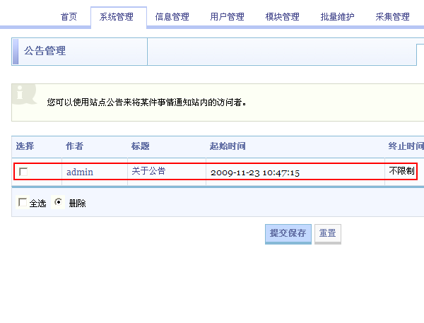 SupeSite 后台 => 系统管理 => 公告管理 公告列表显示如下
