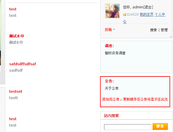 通过 SupeSite 的公告功能,可以将一些公示信息通知站内用户或访问者,公告是一个网站对外公布信息的一个重要渠道。