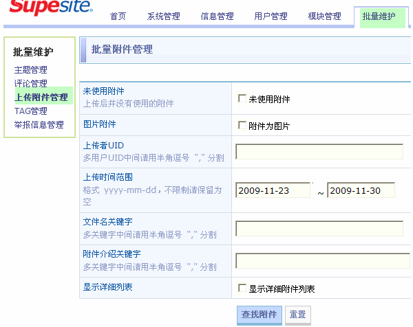 在 SupeSite 7.5 里可以批量维护站点上上传的附件。