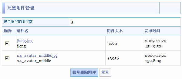 选择您需要操作的附件(复选框打勾),点击“批量删除附件”,进行操作。点击“重置”可以恢复初始的全选状态。