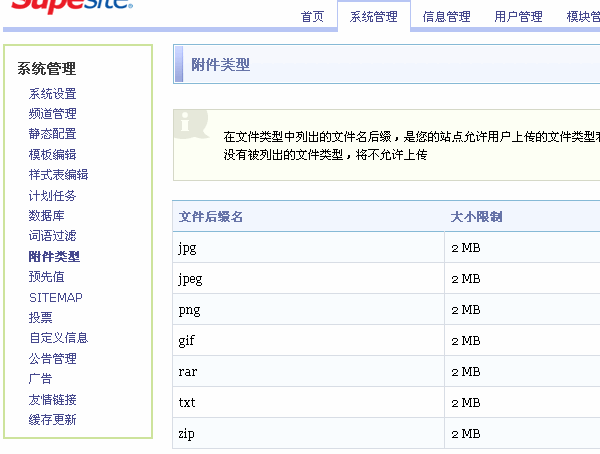 附件类型可以设置您的站点允许用户上传的文件类型和允许上传的最大尺寸,没有被列出的文件类型,将不允许上传,进入系统后台 => 系统管理 => 附件类型。