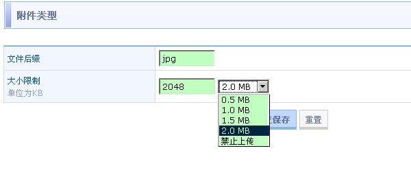 编辑页面中可以设置此附件类型的允许大小,下拉框中有几个预设值,也可以手动输入以 KB 为单位的数字,这里 1M = 1024KB。