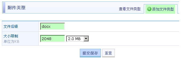 可以看到系统内置了几种附件类型,并限制了上传大小。