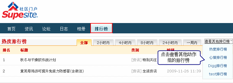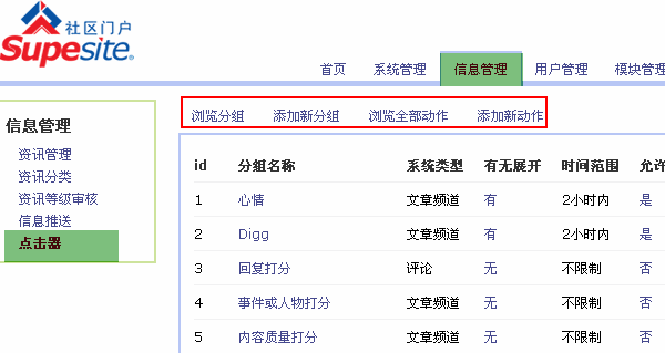 SupeSite7.5后台 => 信息管理 => 点击器 => 浏览全部动作 => 选择动作组: