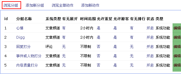 SupeSite7.5自带了 5 个分组,点击每个分组后面的“编辑”,可以编辑该分组的配置: