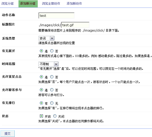 SupeSite7.5后台 => 信息管理 => 点击器 => 添加新分组: