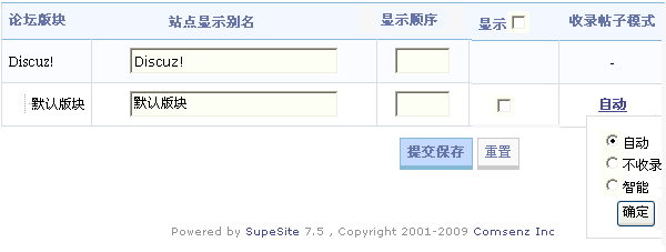 这里可以设置论坛版块在 SupeSite 站点页面上的显示时的别名、以及版块内帖子的收录模式