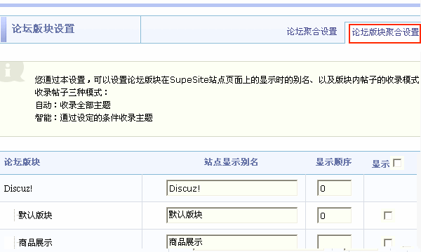 在进行了论坛设置之后可以开始设置版块聚合,这个功能用来设置在 SuperSite 的论坛频道里面显示论坛的那些版块,并且能够重新设置版块显示出来的名称,还能设置版块帖子收录的方式。设置位置在聚合设置 => 版块聚合 => 论坛版块聚合设置。