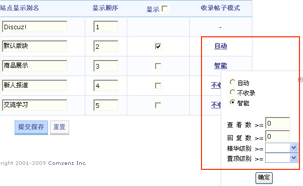 收录论坛帖子的模式一共分三种:自动,智能,不收录。
