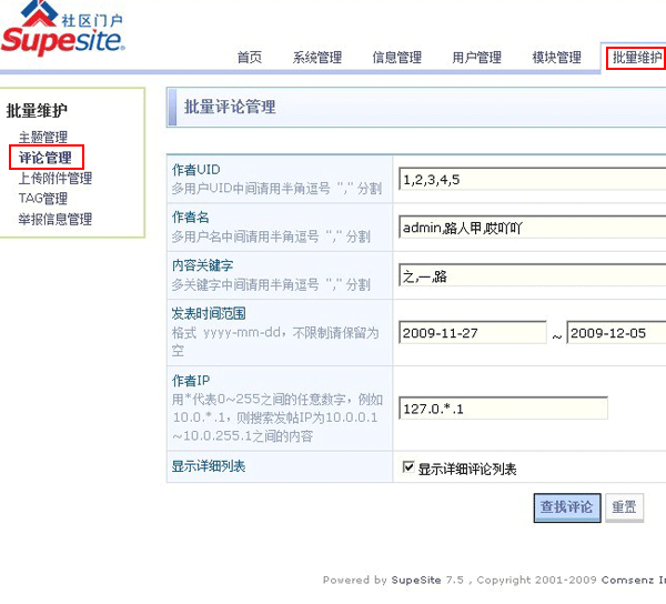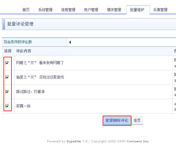 SupeSite 后台 => 批量维护 => 评论管理,如下图: