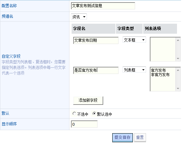 点击右侧的“添加新配置”,来编写两个新项。此处为您演示添加自定义信息组(文章发布测试),内部包含两个项,分别为:文本型信息(文章作者)和列表型信息(是否为官方发布)。如下图所示: