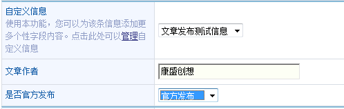 添加完成之后,如何使用,请点击 后台 -> 信息管理 -> 资讯管理 ->发布信息 下方会出现“自定义信息”设置框,这里会显示“文章发布测试信息”,在此处可以填入“文章作者”和选择“是否官方发布”。然后发布一个测试型资讯测试一下。如下图所示: