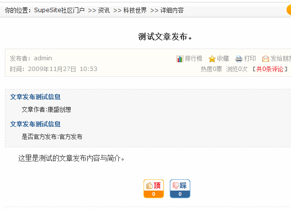发布资讯以后,来到前台资讯展示页面。会看到自定义信息已经显示在这里。如下图所示: