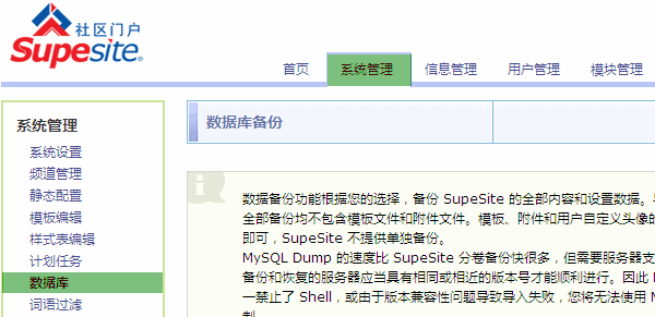 SupeSite 提供了方便的数据库备份和恢复功能,站长只需在后台即可备份和恢复数据库。