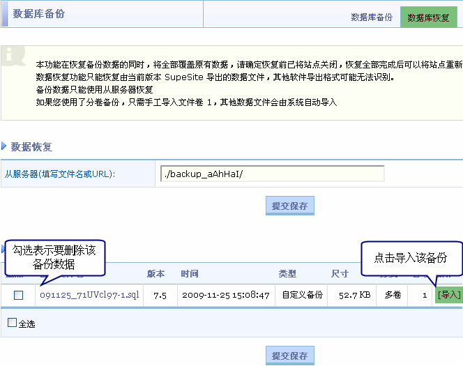 1) 数据备份功能根据您的选择,备份 SupeSite 的全部内容和设置数据。导出的数据文件可用“数据恢复”功能或 phpMyAdmin 导入。