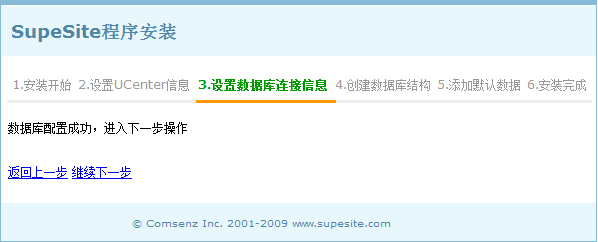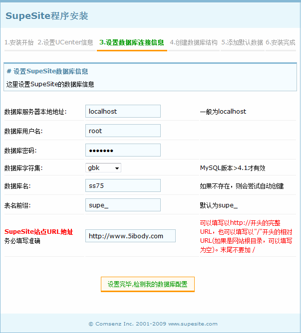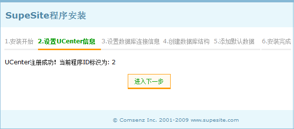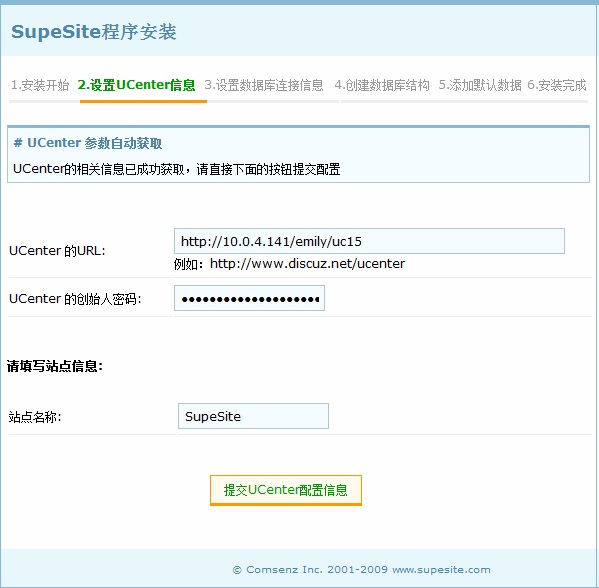 点击“接受授权协议,开始安装SupeSite”进入设置 UCenter 信息阶段: