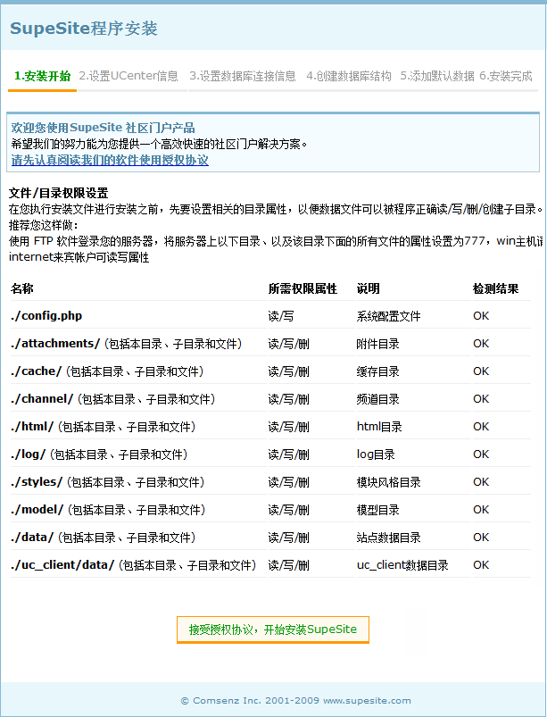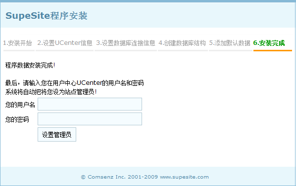 在安装 SupeSite 7.5 前,必须先安装 UCenter 1.5,安装 UCenter 1.5 的步骤这里就不再重复说明,需要教程的站长可以到 UCenter 1.5.0 安装说明查看。