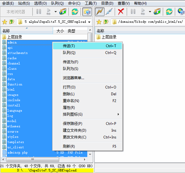 将 upload 目录下的所有文件使用 FTP 软件上传到空间(以下截图中使用的 FTP 软件为 FlashFXP,有关此工具的使用教程详见:FTP 使用教程http://idc.comsenz.com/store/help/thread-152-1-2.html)。