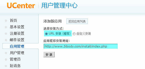 登录 UCenter 用户管理中心 => 应用管理 => 添加新应用 => URL 安装 (推荐):输入 SupeSite 访问域名