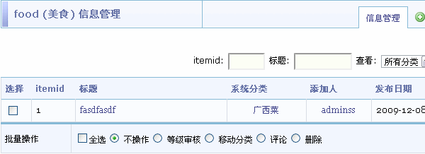 点击“信息管理”链接,可以对所有信息进行批量管理操作,包括批量等级审核、批量移动分类、设置评论,以及批量删除操作: