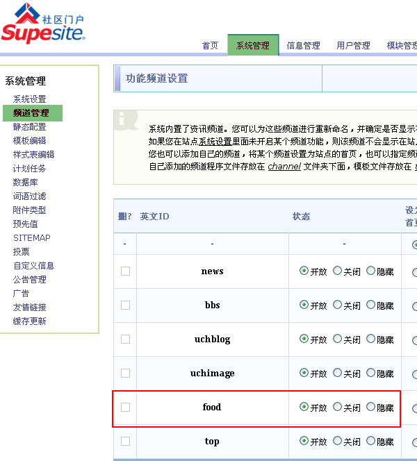 管理后台 => 系统管理 => 频道管理: