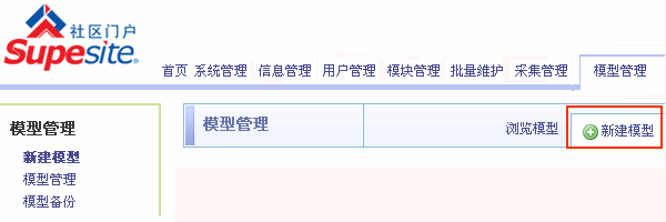 SupeSite 后台 => 模型管理 => 新建模型