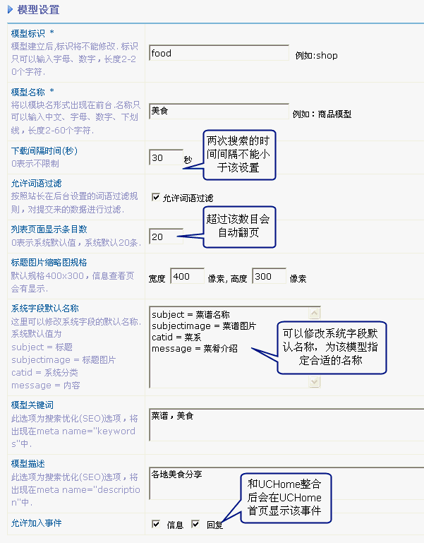 SupeSite 可使站长方便地在首页添加频道,您不必要有代码能力,只需在后台按照提示填写频道模型的各个设置,然后开启该模型即可成功添加频道。这就是新建模型功能。