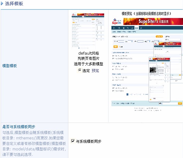 模型模板:选择该模型将要使用的模板,如果您的SupeSite有多套模板,都将会在这里显示,以供选择。