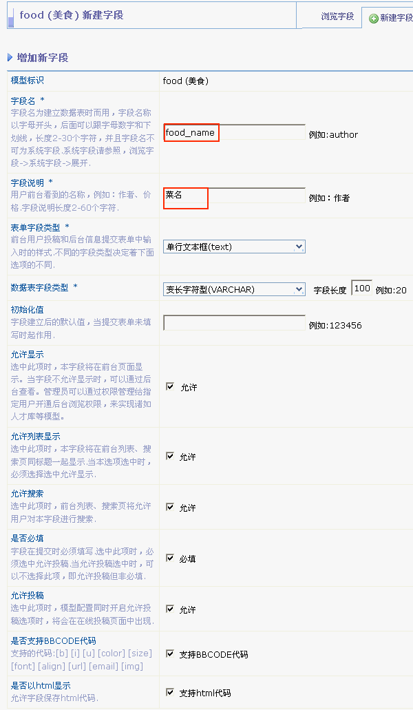点击“新建字段”,进入新建字段页面,下图所示:
