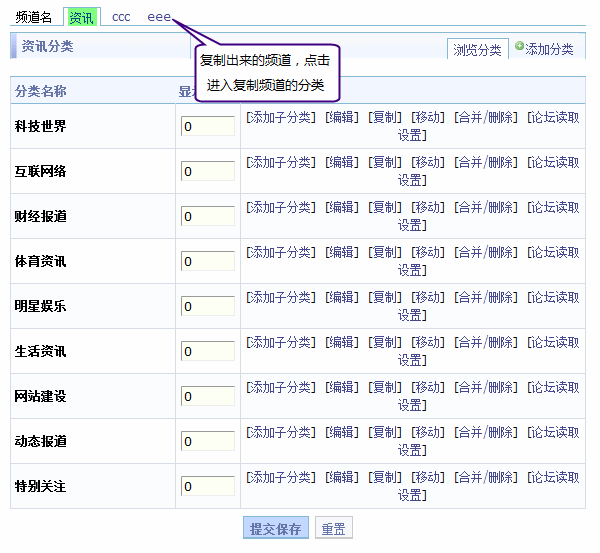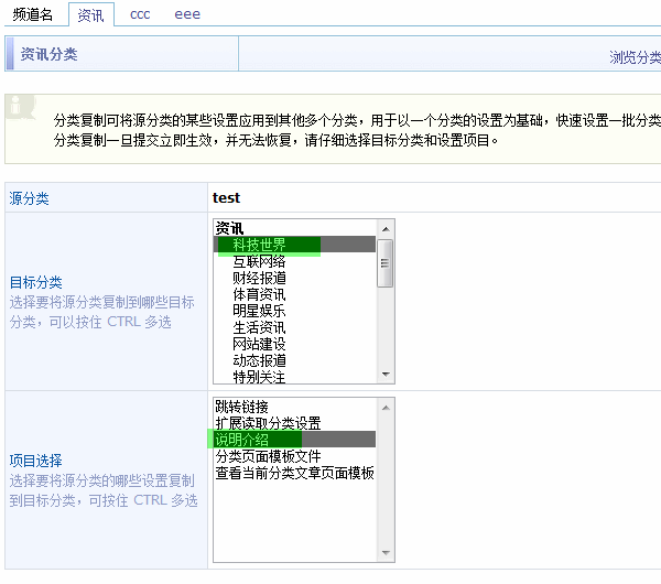 如我们把新建的分类“test”的说明介绍复制到“科技世界”分类中,如图: