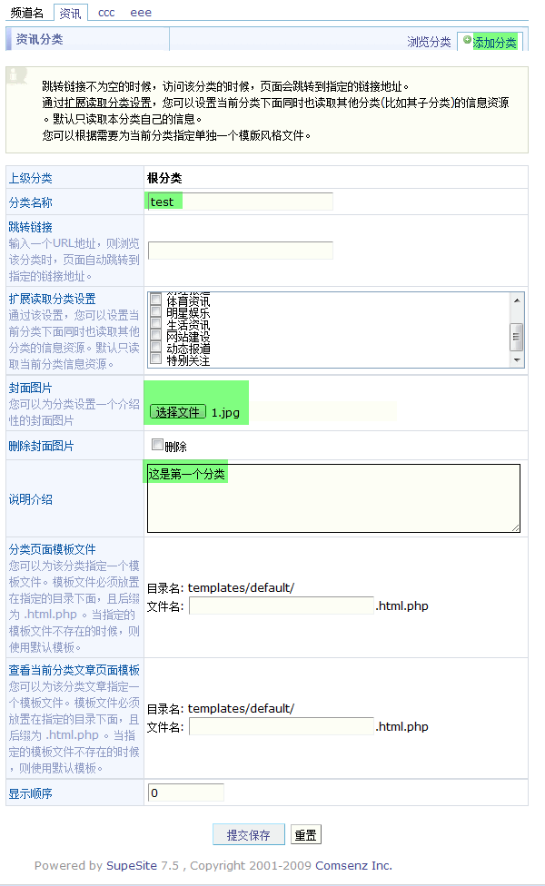 SupeSite 7.5 默认自带九种资讯分类,为了考虑不能满足广大站长的要求,SupeSite 的后台可以随意添加资讯的根分类和二级分类,这个功能主要是关于资讯分类的添加、子分类的添加、编辑分类、合并删除分类、以及论坛读取设置。