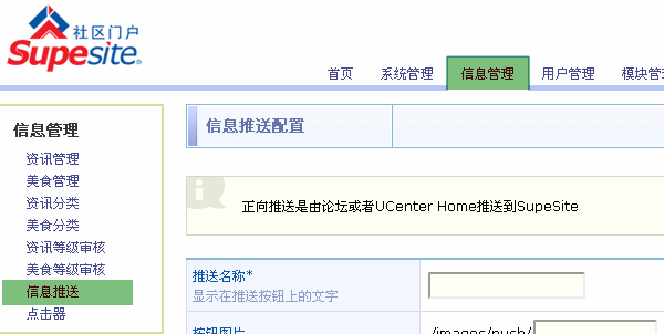信息推送是 SupeSite7.5 的新增功能,可以使 SupeSite 和 UCenter Home 及 Discuz! 之间的数据互相推送,增加了站点应用之间的互动性。