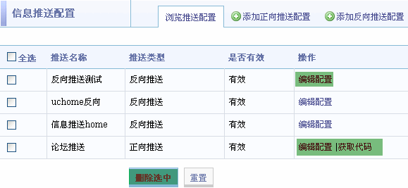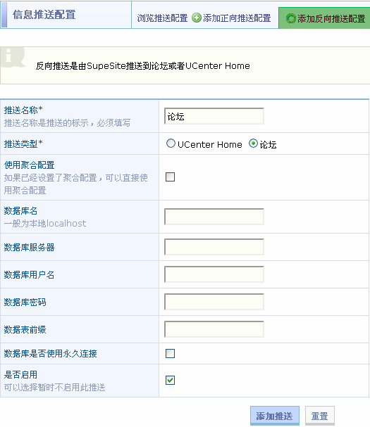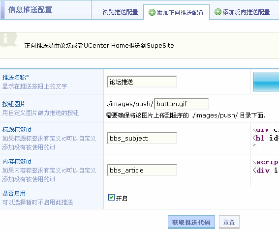 正向推送是由论坛或者UCenter Home推送到SupeSite。点击“添加正向推送配置”: